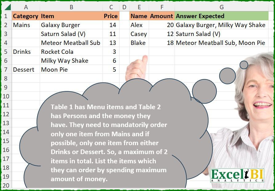 Then, calcualate the sum of the pairs of mains and non-mains. Then look up from these pairs that pair whose price-sum is largest but not greater than the Amount for each person in Table 2. This is the pair which has them buying one main and one non-main and spending the maximum amount. Return the comma-separated list of Main and optionally Non-Main for each person.