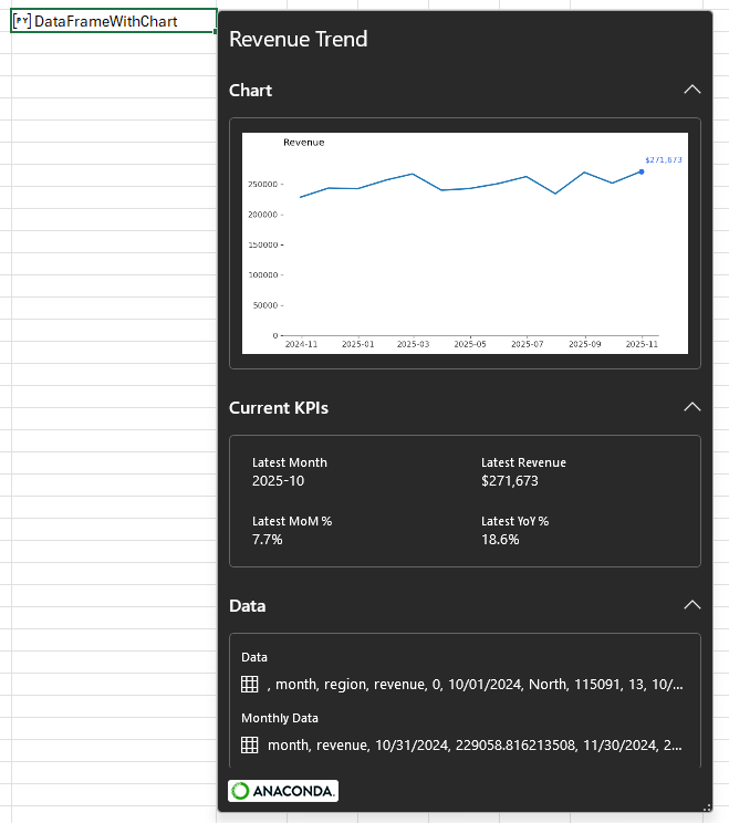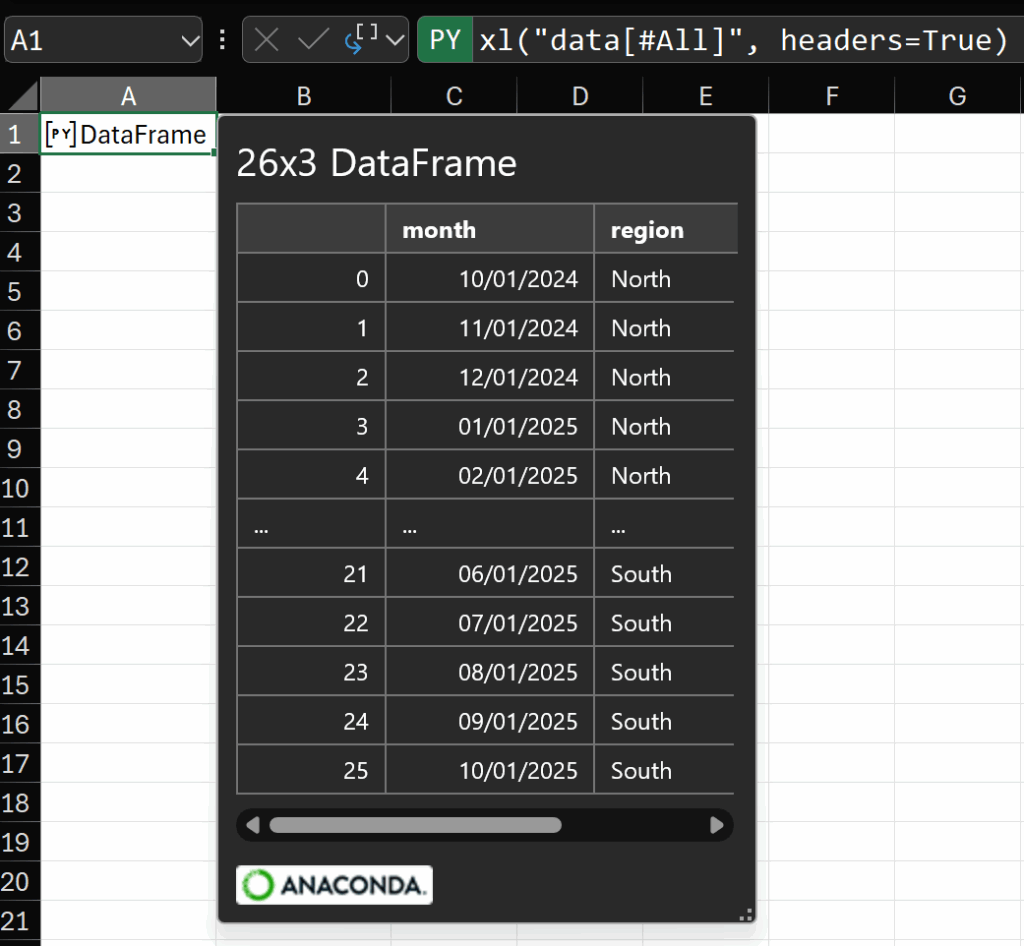 In our simple example, if we use “Excel Value” when the object is a DataFrame, then Python in Excel uses a built-in function, called a repr, to convert that DataFrame into a format that Excel can spill. In the UI, it looks like this: