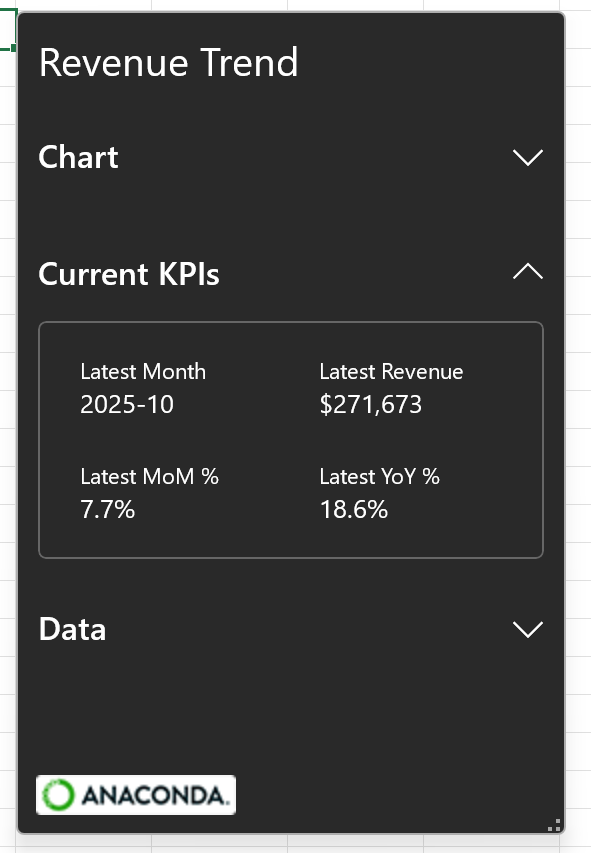 Because these requests (the chart and the metrics) are always the same, but they regularly come from different people and in files of different states of readiness (some may already have many sheets of complex calculations), building an Excel template is not the best solution. Instead, we’ll write code to create the chart, calculate the metrics, and expose all of those things along with the data of the dataset itself, in case any further calculations are needed.