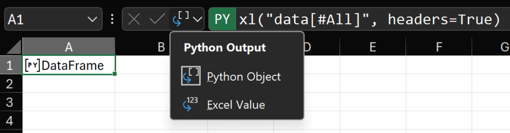 There are two output modes in Python in Excel: “Excel Value” and “Python Object”. When you create a Python cell in Excel, you will see the “Python Output” button to the left of the formula bar. Clicking that button enables switching between output modes.
