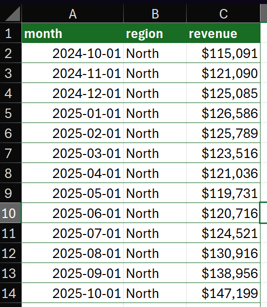 The examples in this post will focus on an artificial dataset of revenue by region and month for the 13 months between October 2024 and October 2025. For purposes of demonstration and discussion, there are two regions. Here is a sample: