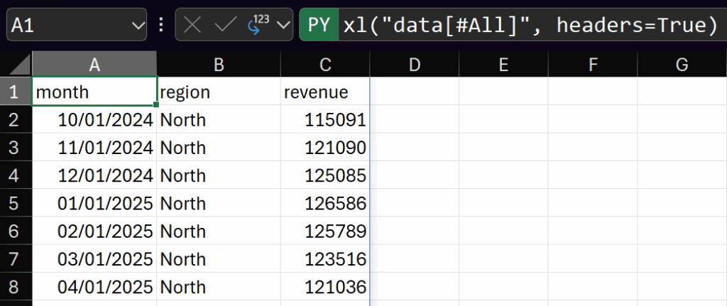 Recall that the result of a Python cell is whatever is returned by the last line of Python in that cell. So, in this example, since the last line (which is also the only line) is a call to xl(), the result is a DataFrame.